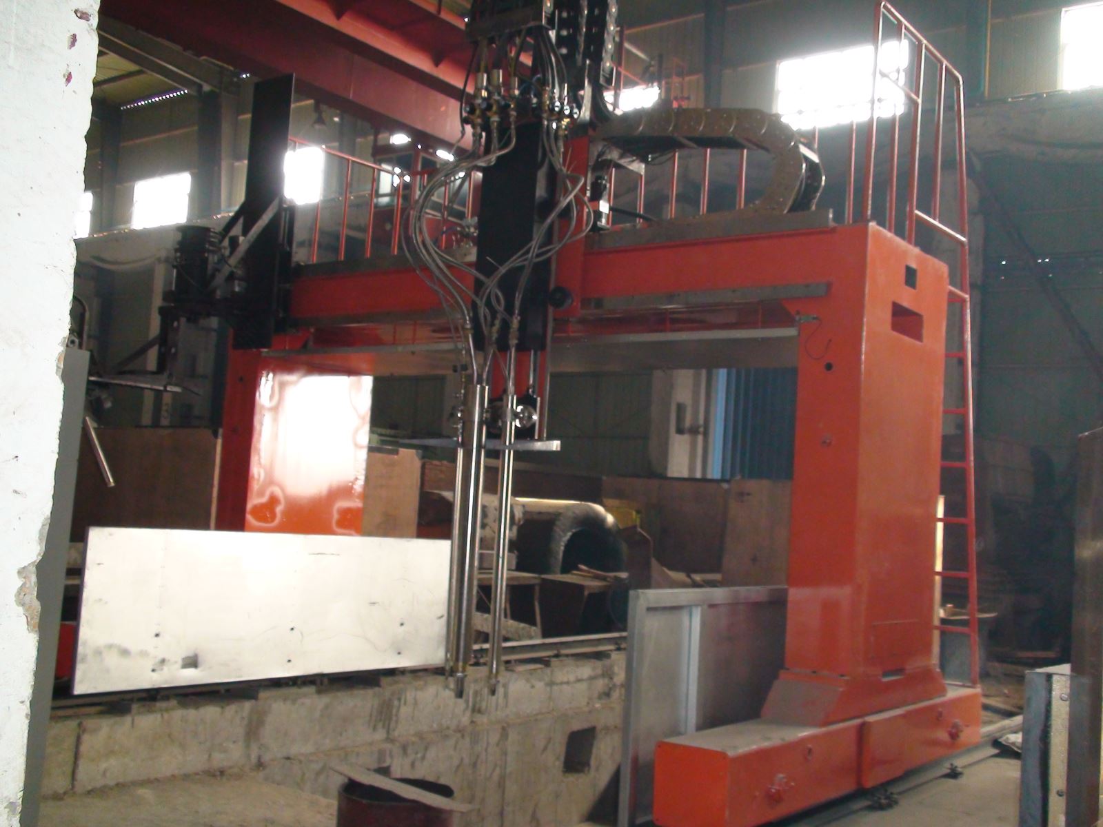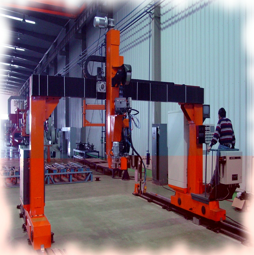 ● 龍門所配二臺焊機、保護(hù)氣氣瓶(至少2個)、控制柜等均放在龍門兩側(cè)托架上,隨龍門一起移動,進(jìn)龍門的外部供電線纜采用滑線供給,使得龍門移動范圍加大。